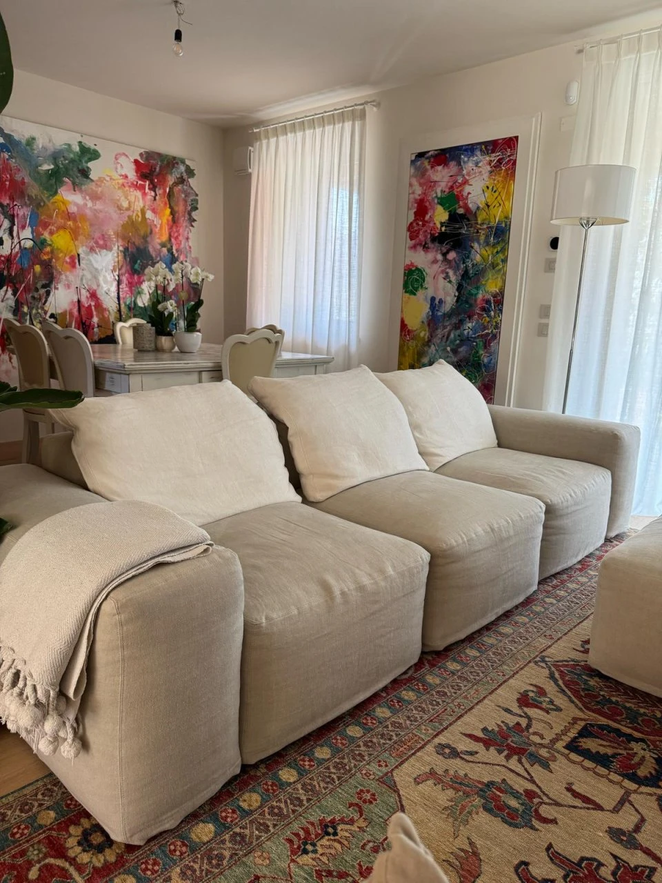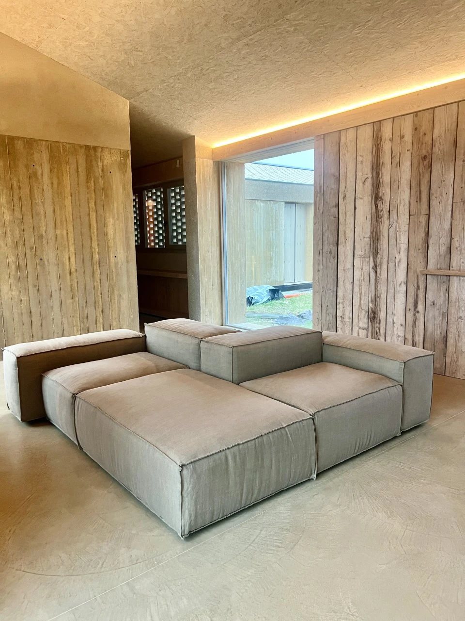 I cuscini della seduta uniscono sostegno e morbidezza grazie alla combinazione di poliuretano espanso e piuma d’oca suddivisa in settori, mentre quelli dello schienale, interamente in piuma d’oca e rivestiti in cotone, offrono un’accoglienza naturale e avvolgente.